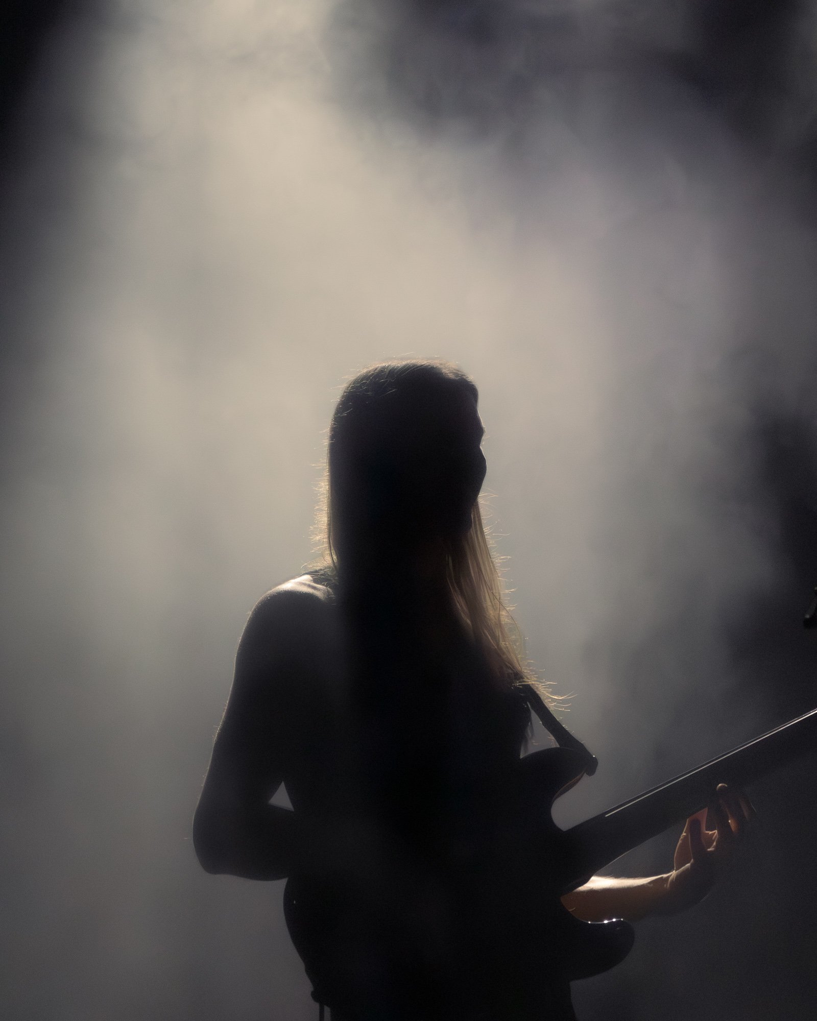Silhouette of a woman playing an electric guitar in a foggy or smoky environment with backlighting.