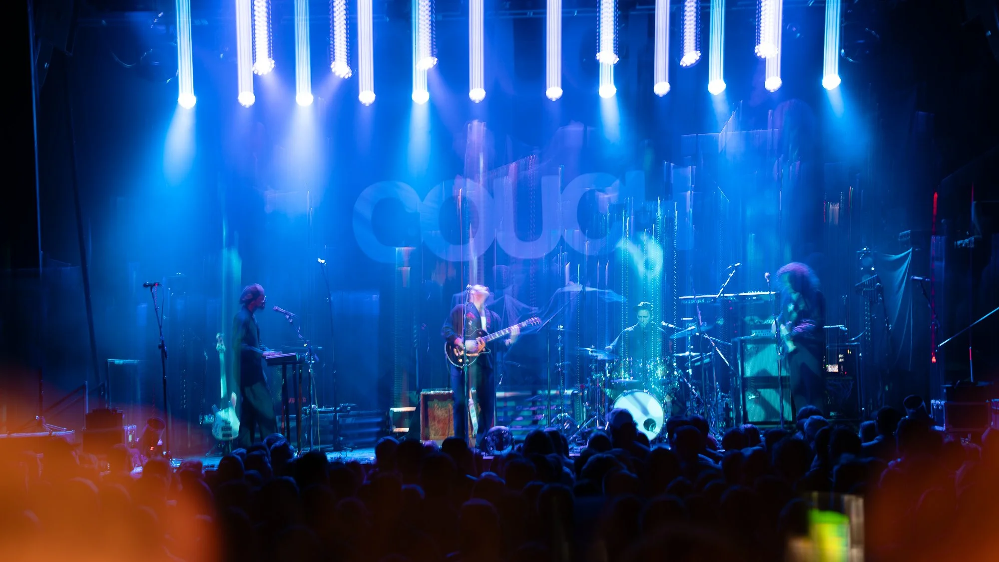A live music concert with a band performing on stage under colorful purple, pink, and blue lights. The band includes a female singer with glasses and a red vest, a guitarist with long hair, and another guitarist wearing a red cap. The audience is vis