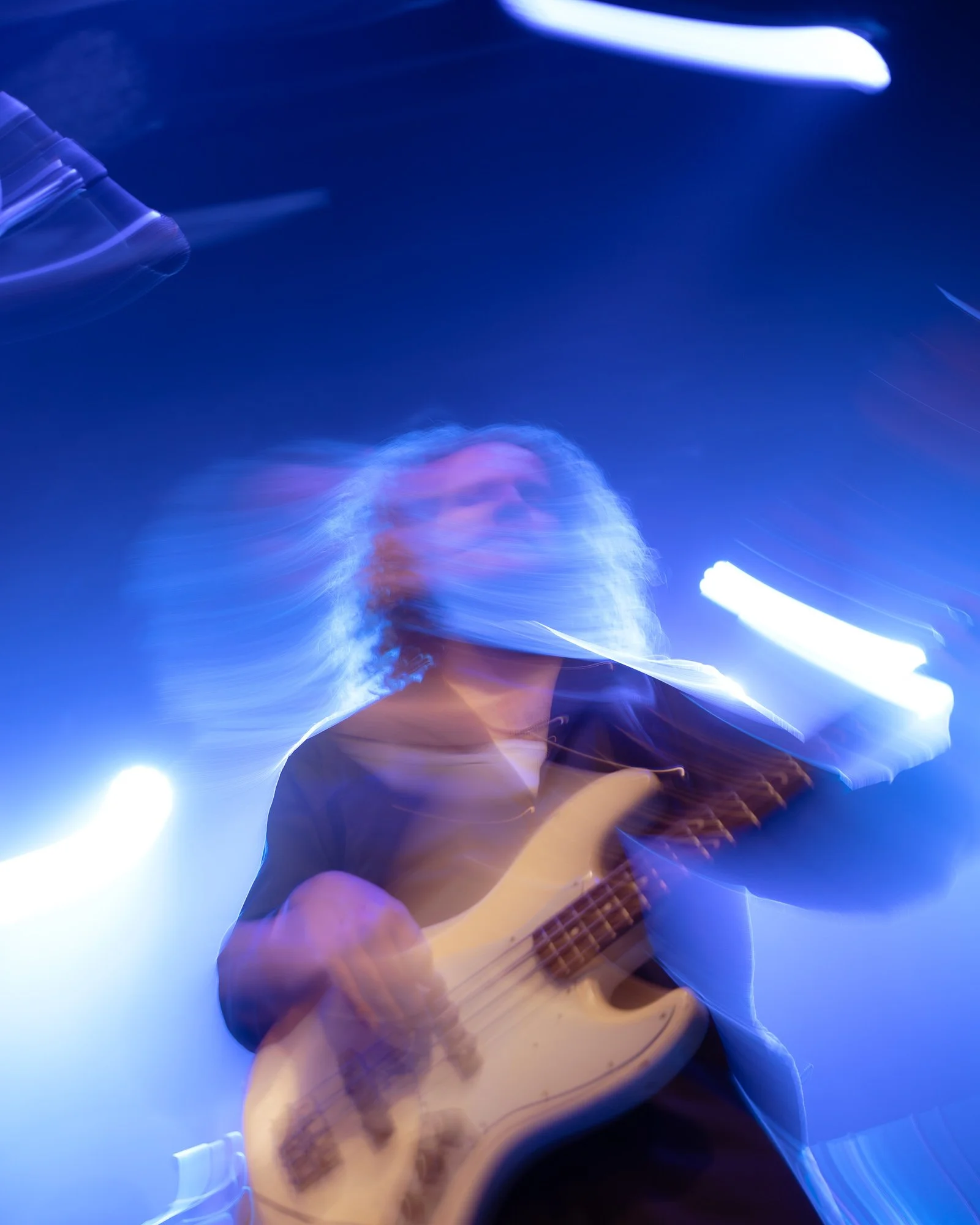Back view of a musician with shoulder-length dark hair playing a keyboard on stage, with a microphone stand nearby and a drummer blurred in the background, in a dimly lit venue with visible audience.
