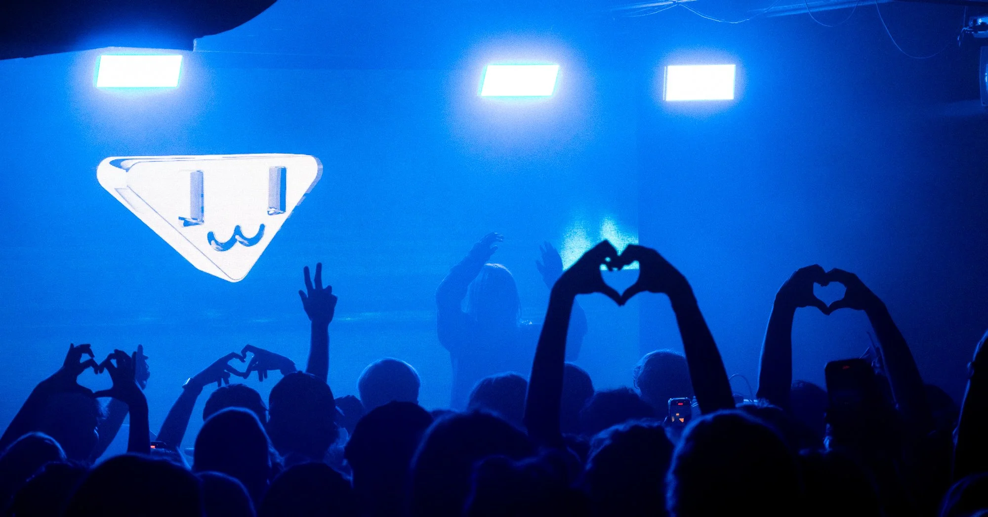 A crowd at a concert or event with hands raised, some making heart shapes, illuminated by blue stage lighting, with a white neon sign with a cartoon face in a triangular shape on the wall.