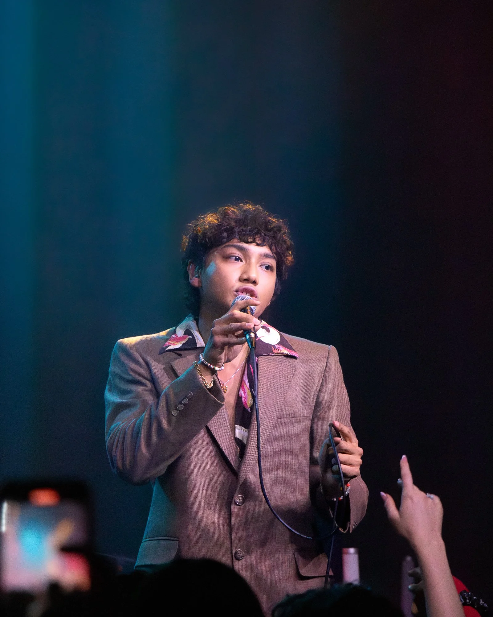 A young man singing on stage with a microphone, wearing a brown suit and colorful shirt, surrounded by stage lighting and an audience.